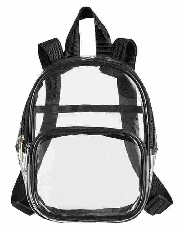 Clear PVC body; Contrasting binding; Zipper closure main compartment; Front zipper pocket: 6.5" x 4.5" x 0.5"; Inside slit pocket; Contrasting sdjustable straps; 6.5"W x 8.5"H x 2.75" D; Requires California Prop 65 Warning Label