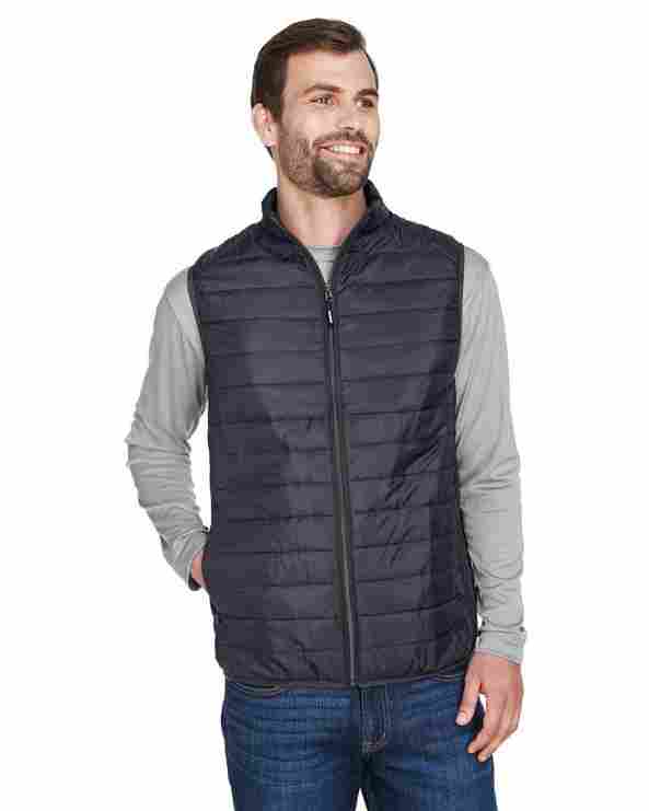 body: 1.2 oz. / 39 gsm 100% polyester with water resistant finish; lining: 100% polyester; insulation: 80 gsm thermal poly fil; center front zipper with autolock slider and reflective toggle; lower pockets with invisible zippers; stretch binding at armholes and hem; packable style into separate storage pouch;
