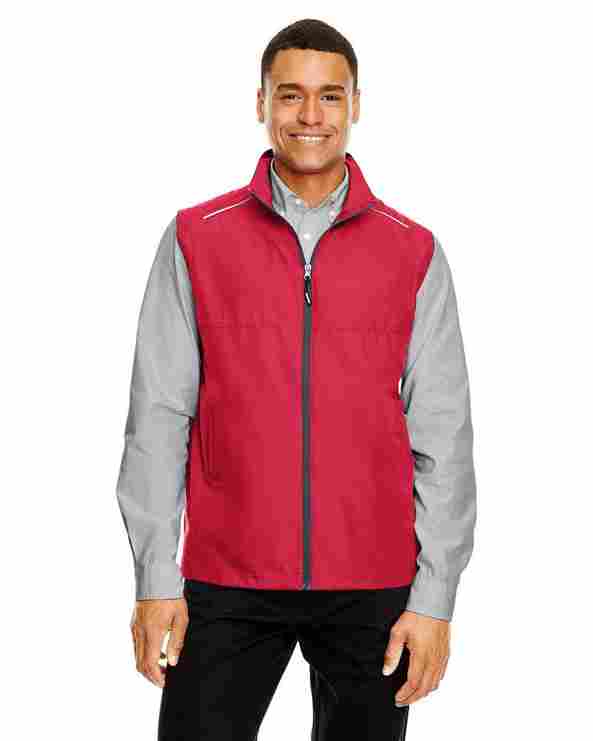 2.3 oz. / 78 gsm 100% polyester pongee; water-resistant finish; center front reverse coil zipper with autolock slider and reflective toggle; lower concealed pockets with zippers; adjustable shockcord at hem; reflective piping at front shoulders;